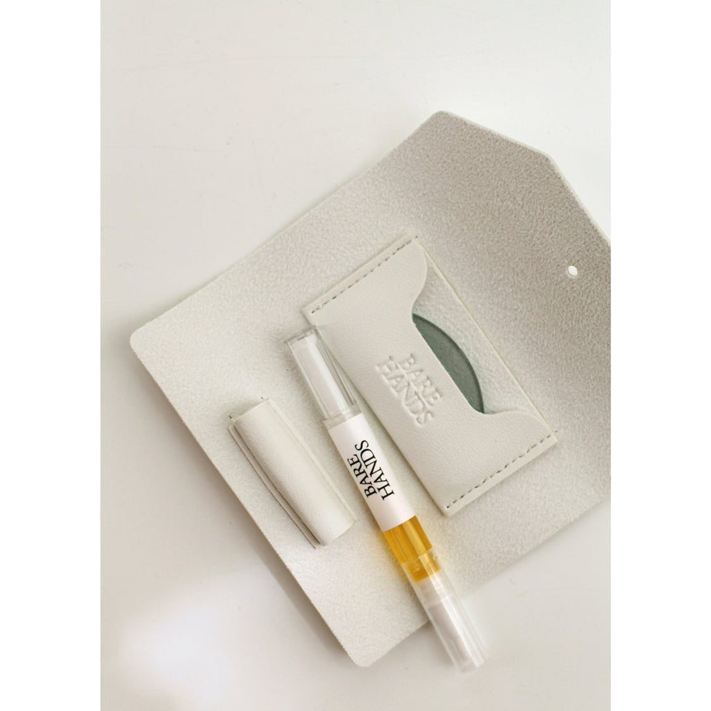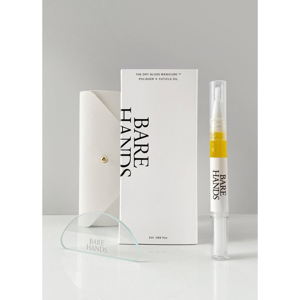 Reveal your healthiest natural nail. Packed in a vegan leather case, The Polisher and Cuticle Oil hydrate, condition cuticles, and add a natural shine—with only the purest ingredients. The Polisher’s glass and mineral blend gently bind keratin cells with no chipping and no dry time needed. Kit comes with 2 wooden push sticks and a cloth chamois.
