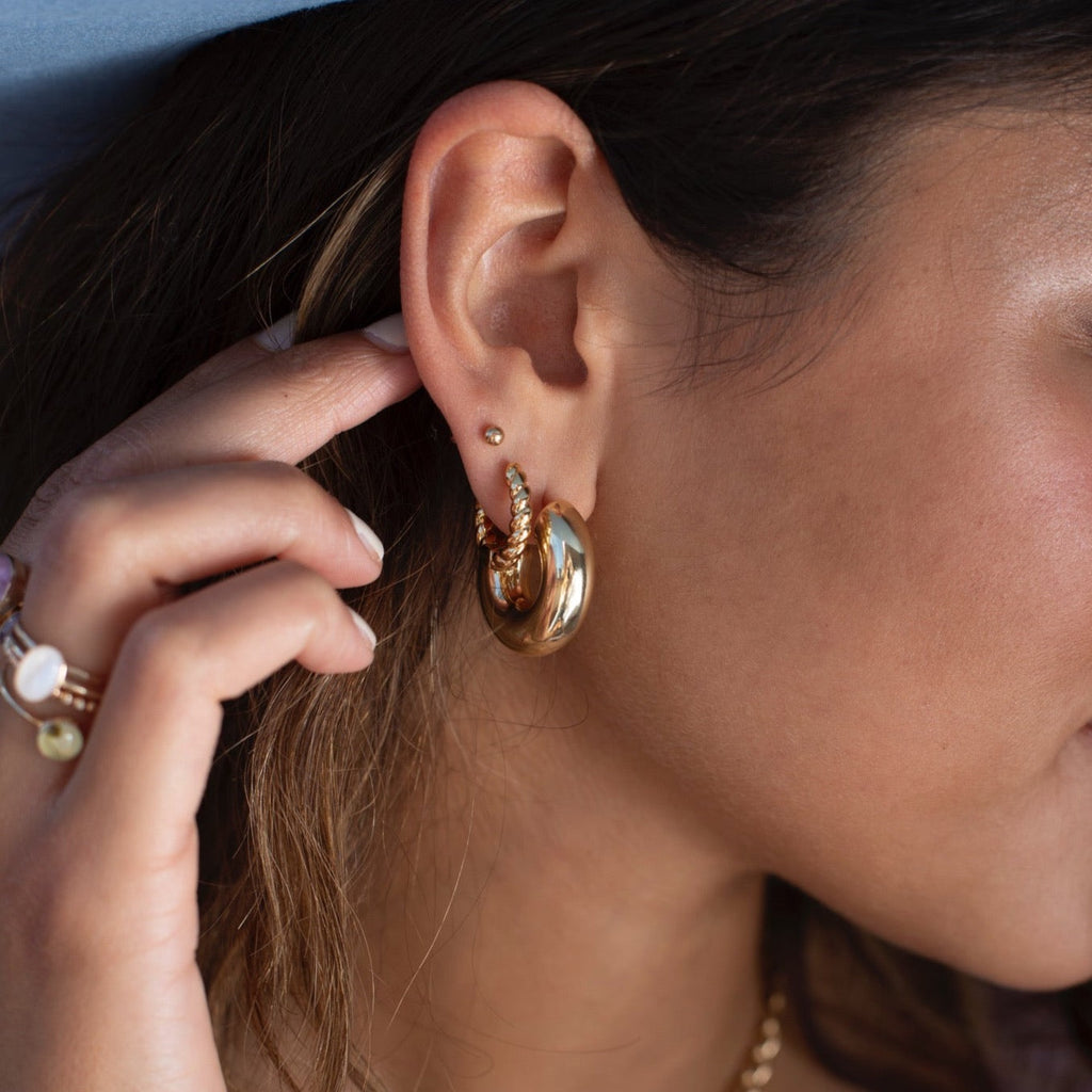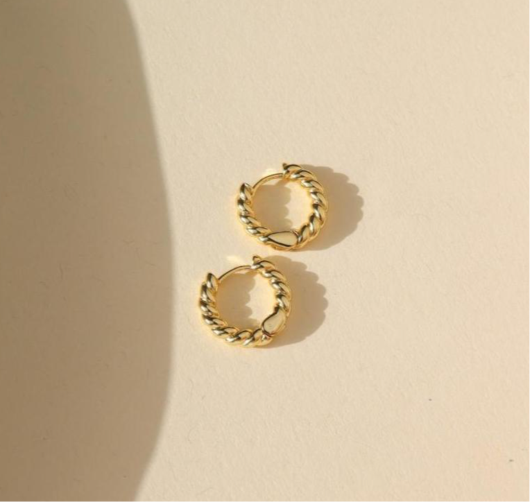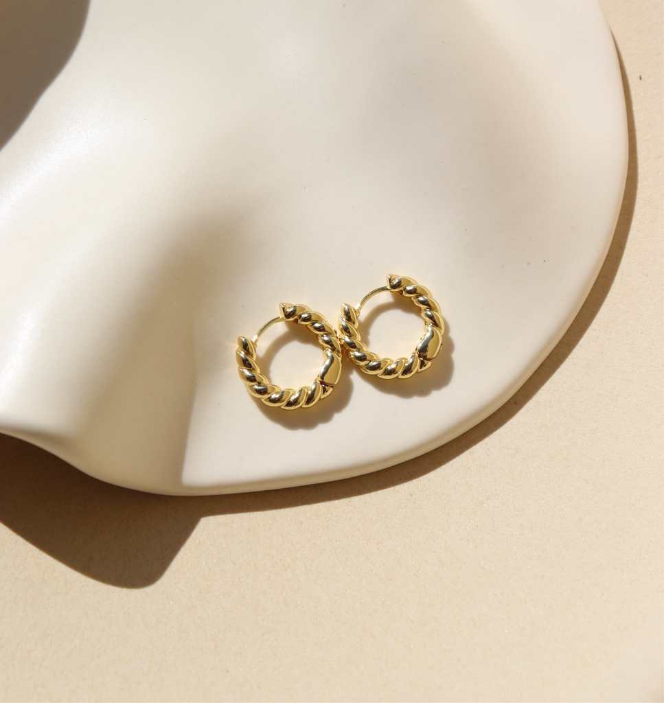 Croissant Huggie Hoops-the spiral chunky hoop earring that will become your go-to accessory. These light-weight chunky textured hoops hug your earlobes and make the perfect everyday earring.